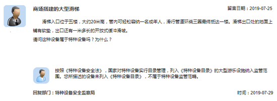 有网友于7月25日在国家市场监督管理总局网站公众留言系统咨询商场搭建的大型滑梯是否属于特种设备,7月29日,市场监管总局特种设备安全监察局给予了答复。