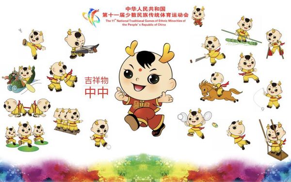 作为此次运动会的吉祥物“中中”是龙娃,穿着中国传统服饰。胸前装饰图案取自郑州出土的商代经典青铜器“商鼎”,体现举办地郑州深厚的历史文化积淀。“中”是河南的特色方言,郑州自古就有“天地之中”的美誉。在河南人民的生活语言里,“中”字表达的意思是肯定、鼓励和赞誉,饱含着河南人民对运动会圆满成功的祝愿。