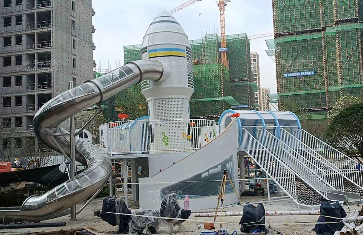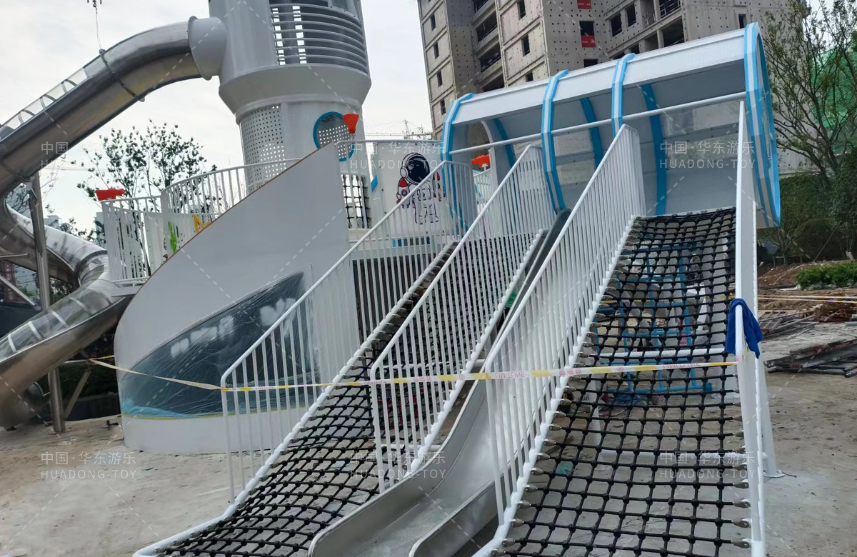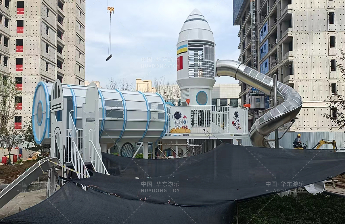 安徽省亳州市涡阳县荣徽上河郡选用的是必一运动游乐自主研发和生产的以航天飞机为主题的大型非标定制的游乐设备,是一款具备了攀爬网、攀爬梯、旋转滑筒、儿童摇摇乐为一体的综合性儿童游乐场。