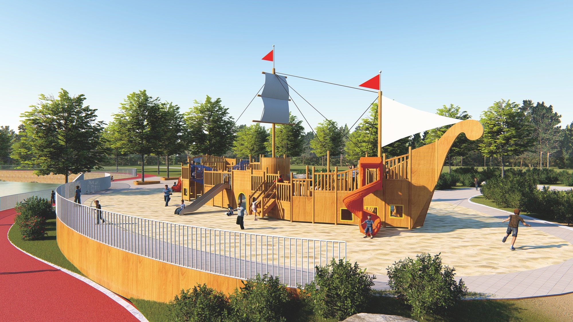 木质海盗船组合滑梯的设计以大自然为主题,融合了船体、桅杆、甲板等元素,外观新颖、结构牢固。它集攀爬、滑梯、秋千等功能于一体,旨在锻炼孩子的平衡协调能力和自我保护意识,同时培养探险精神。